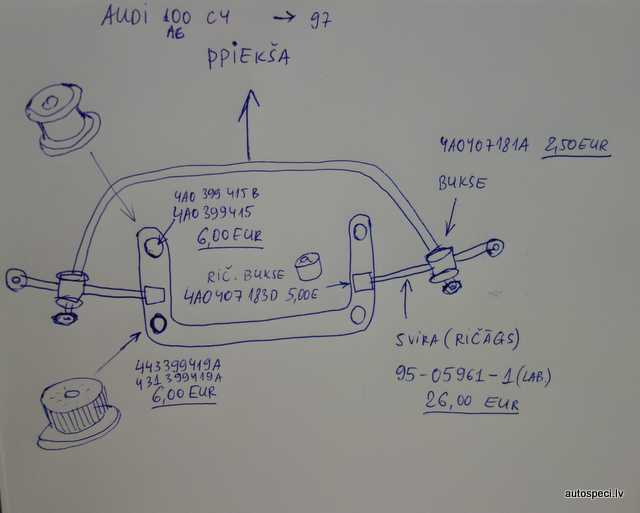 – aizmugurējais var izmantot KIT 506043 cena 7.00 Eur. Monroe KOMPLEKTS vienai pusei PK094 cena 22.00 Eur xxx1. Meyle KOMPLEKTS vienai pusei 1005120024, 4A0512129 cena 13.00 Eur.